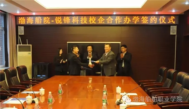 高文良院長與李雪峰總經(jīng)理共同簽署了《渤海船舶職業(yè)學(xué)院與遼寧銳鋒科技有限公司校企合作協(xié)議書》。