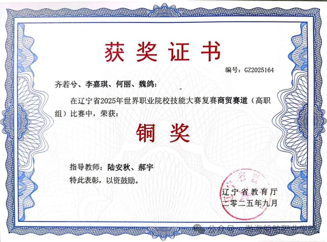 近日,遼寧省2025年世界職業(yè)院校技能大賽復(fù)賽商貿(mào)賽道(高職組)公布成績(jī)。我校經(jīng)濟(jì)與管理學(xué)院陸安秋、郝宇老師擔(dān)任指導(dǎo)教師,電子商務(wù)專業(yè)齊若兮、李嘉琪、魏鴿、何麗同學(xué)組成的參賽團(tuán)隊(duì),憑借扎實(shí)的專業(yè)技能、創(chuàng)新的思維和出色的團(tuán)隊(duì)協(xié)作,榮獲該賽道銅獎(jiǎng)。