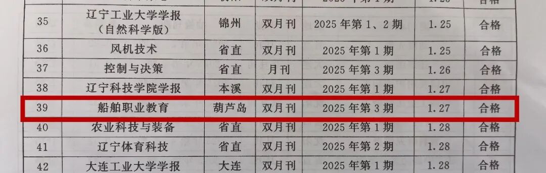 近日,在遼寧省新聞出版局組織的2025年全省期刊編校質量檢查工作中,我校主辦的《船舶職業(yè)教育》期刊差錯率為萬分之1.27,在全部抽檢的111種期刊中排名第39位,順利通過此次檢查。