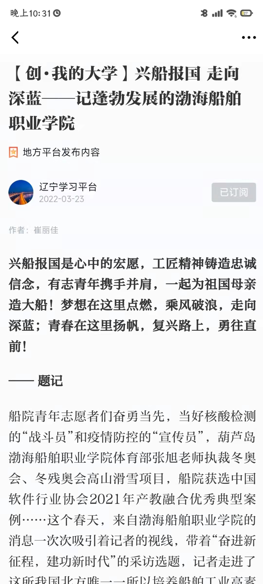 船院青年志愿者們奮勇當(dāng)先,當(dāng)好核酸檢測(cè)的“戰(zhàn)斗員”和疫情防控的“宣傳員”,船院體育部張旭老師執(zhí)裁冬奧會(huì)、冬殘奧會(huì)高山滑雪項(xiàng)目,船院獲選中國(guó)軟件行業(yè)協(xié)會(huì)2021年產(chǎn)教融合優(yōu)秀典型案例……這個(gè)春天,來(lái)自渤海船舶職業(yè)學(xué)院的消息一次次吸引著記者的視線,帶著“奮進(jìn)新征程,建功新時(shí)代”的采訪選題,記者走進(jìn)了這所我國(guó)北方唯一一所以培養(yǎng)船舶工業(yè)高素質(zhì)技能型人才為主的國(guó)家示范性骨干高等職業(yè)學(xué)院。