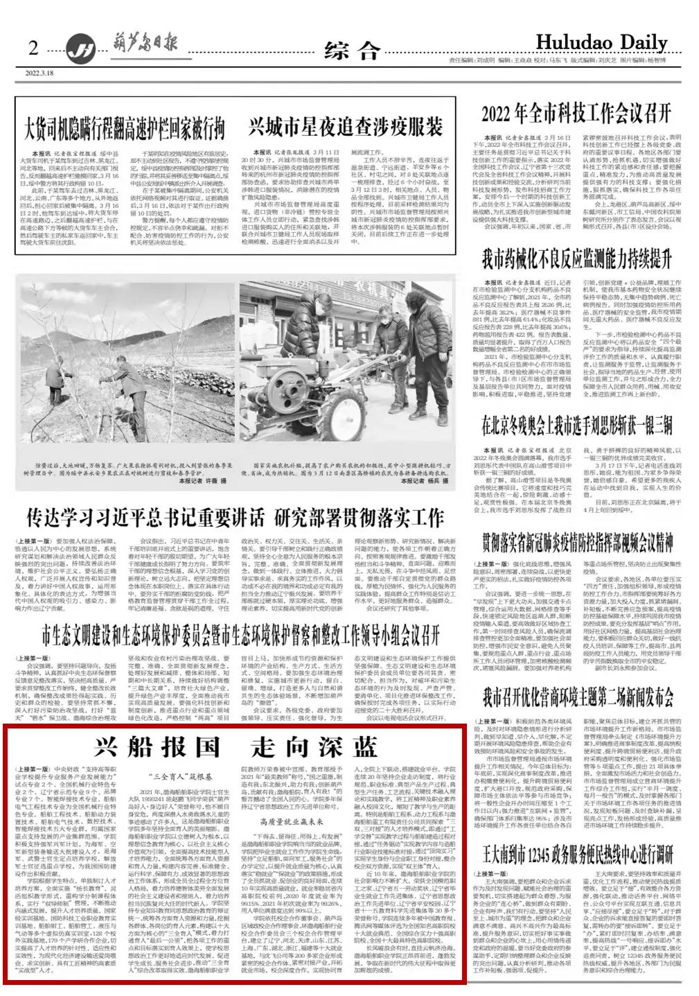船院青年志愿者們奮勇當(dāng)先,當(dāng)好核酸檢測(cè)的“戰(zhàn)斗員”和疫情防控的“宣傳員”,船院體育部張旭老師執(zhí)裁冬奧會(huì)、冬殘奧會(huì)高山滑雪項(xiàng)目,船院獲選中國軟件行業(yè)協(xié)會(huì)2021年產(chǎn)教融合優(yōu)秀典型案例……這個(gè)春天,來自渤海船舶職業(yè)學(xué)院的消息一次次吸引著記者的視線,帶著“奮進(jìn)新征程,建功新時(shí)代”的采訪選題,記者走進(jìn)了這所我國北方唯一一所以培養(yǎng)船舶工業(yè)高素質(zhì)技能型人才為主的國家示范性骨干高等職業(yè)學(xué)院。